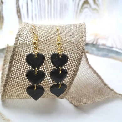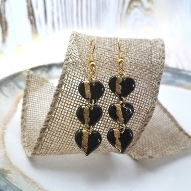 S Triple Heart Shaped Black With Gold Flakes Handmade Dangle Handmade Earrings