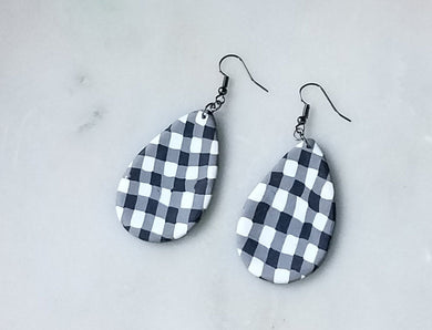 White Buffalo Plaid Polymer Clay L Teardrop Dangle Handmade Earrings