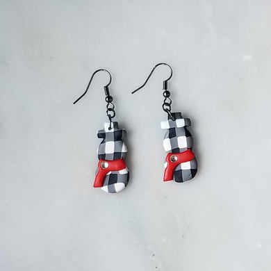 White Buffalo Plaid Polymer Clay Mini Snowman Dangle Handmade Earrings