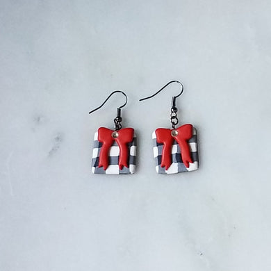 White Buffalo Plaid & Long Red Bow Polymer Clay Square Dangle Handmade Earrings