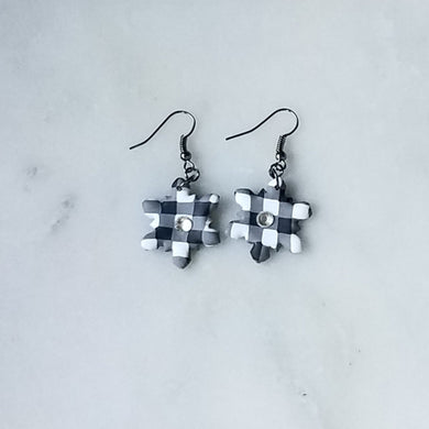 White Buffalo Plaid Polymer Clay Snowflake w/Crystal Dangle Handmade Earrings