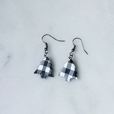 White Buffalo Plaid Polymer Clay Christmas Tree Dangle Handmade Earrings