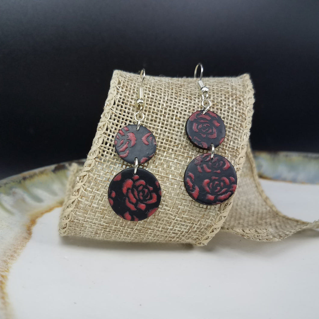 Double Circle Rose Pattern Black & Red Dangle Handmade Earrings. Made from polymer clay. Mounted on hypoallergenic hooks. Crafted in a smoke-free, pet-free studio.Earring findings are metal plated alloy or copper.