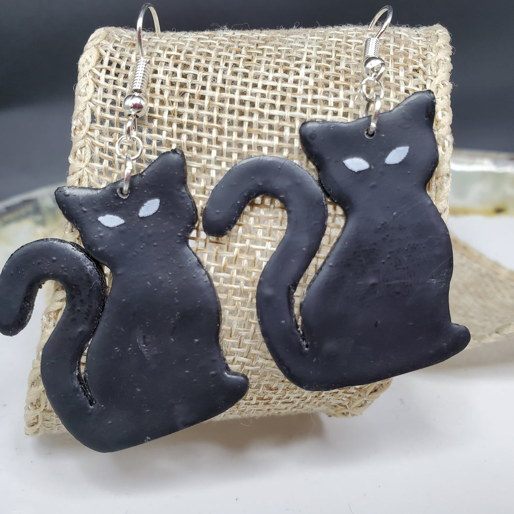 Large Cat Solid Black Dangle Handmade Earrings. Made from polymer clay. Mounted on hypoallergenic hooks. Crafted in a smoke-free, pet-free studio.Earring findings are metal-plated alloy or copper.