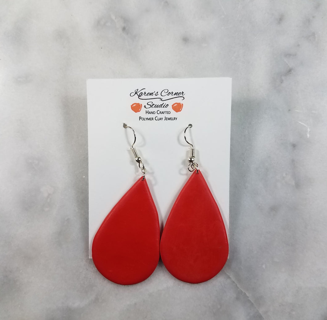 Handmade teardrop-shaped dangle earrings in solid red. Made from polymer clay. Mounted on hypoallergenic hooks. Smoke-free, pet-free home.