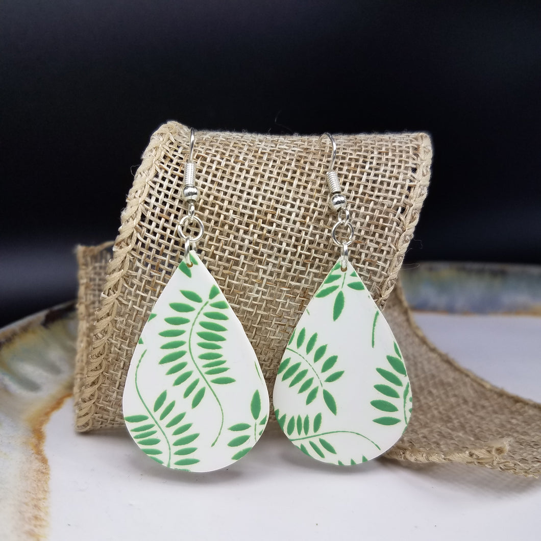 Teardrop Leaf Pattern White & Green Dangle Handmade Earrings. Made from polymer clay. Mounted on hypoallergenic hooks. Crafted in a smoke-free, pet-free studio.Earring findings are metal plated alloy or copper.