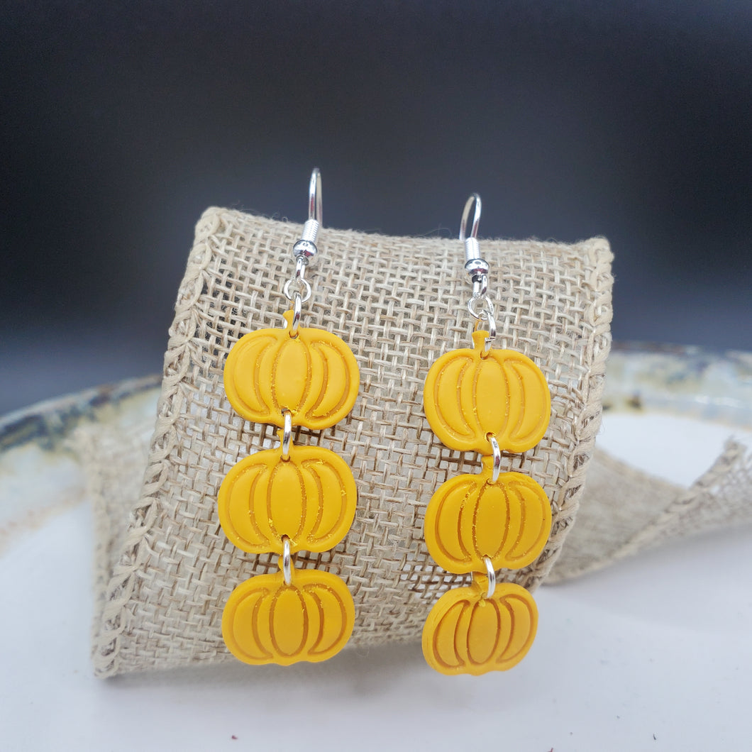 Triple Pumpkin Solid Yellow Dangle Handmade Earrings. Made from polymer clay. Mounted on hypoallergenic hooks. Crafted in a smoke-free, pet-free studio.Earring findings are metal plated alloy or copper.